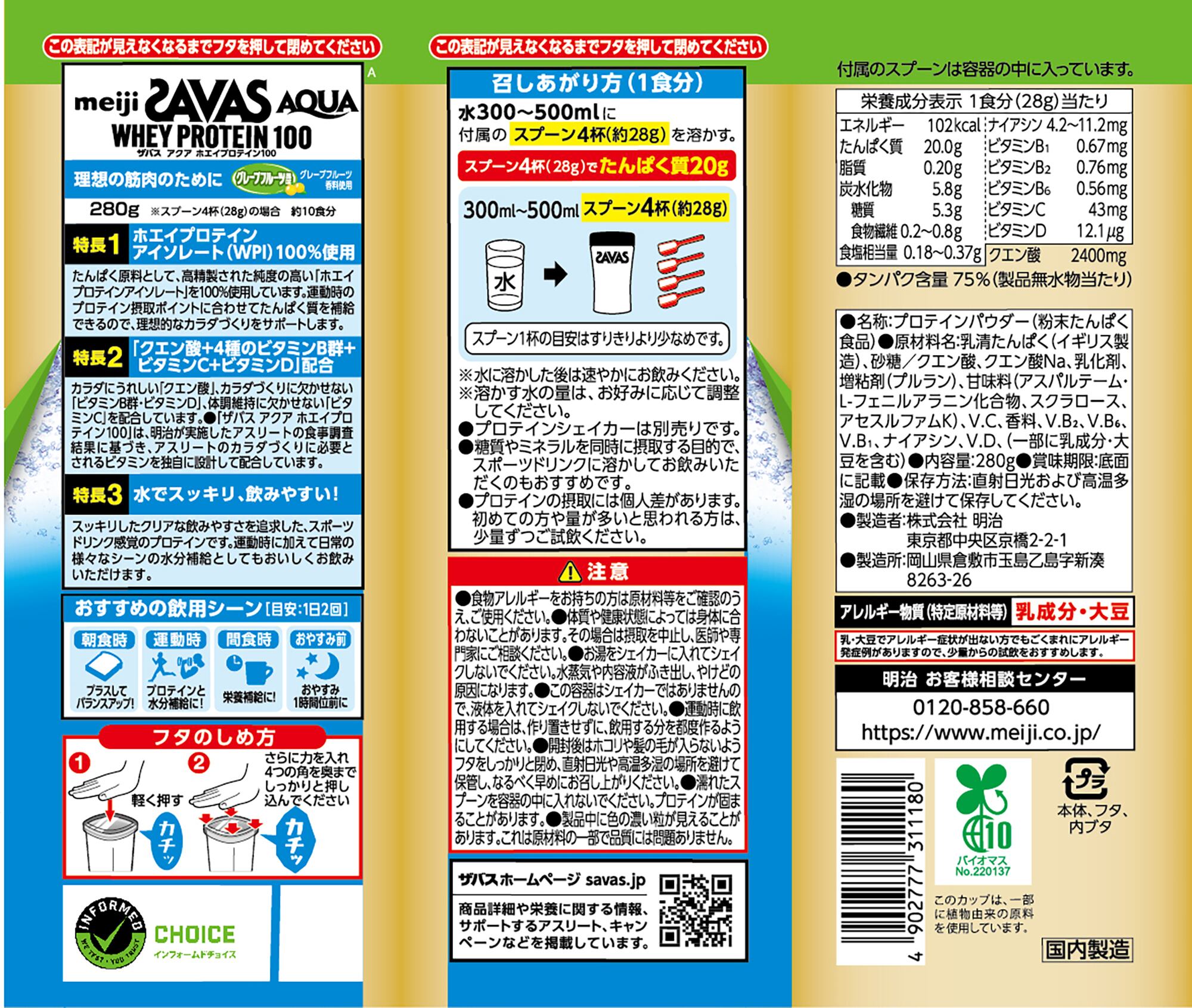 ザバス(SAVAS) アクア ホエイプロテイン100 グレープフルーツ風味 280g